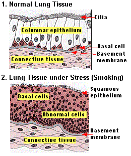 Consider lung cancer. The pictures on the left (click for source) represent the growth of lung cancer in a chronic smoker. The basal cells in normal lung tissue (Graphic 1 on left) represent the stem cells for the columnar epithelium, which is the interior lining of the lungs. This is the tissue most exposed to smoke in a cigarette. Due to cellular stress caused by the toxins in cigarette smoke, the basal cells naturally divide to provide a thicker layer of cells against the toxins (Graphic 2 - after approx. 10 years smoking). The top layer of cells flatten out and form a more protective barrier also. It is almost like the lining of the lungs, is becoming more like your skin to protect you from the toxins. The problem is that many of these basal cells are mutants with a very abnormal nucleus. In time, some mutations happen that cause the cells to produce protease proteins to melt through the basement membrane of the lung tissue (Graphic 3 - after approx. 20 years smoking) and start to invade other tissue. Most of these cells secrete a mucous similar to the basement membrane to protect the group from the immune system. Others will occassionally produce the protease that allow them to break from the group through the mucous and invade additional tissue. Reovirus represents a natural enemy of growing cancers. The lead cancerous cells, secret proteases on their growing edges that melt cell junctions and membranes in front of them. These same proteases melt the outer protective protein coat of the reovirus making it more likely to infect the cell. The cancer cells that produce the mucous also have a problem with Reovirus. An uncoated reovirus particle exposes a sigma1 attachment fiber that can drill through this mucous to reach and infect the cell. Once inside the cancer cell, the Reovirus may invoke cell death and signalling of the immune system through apoptosis, or, it may continue to divide and destroy the cell itself. The response in the cell depends alot on the type of cell mutations it contains. It is thought that a mutation in the Ras cell pathway is enough to signal apoptosis and the immune cells. Further, addtional mutations though Ras/RalGEF/p38 cell pathway determine if Reovirus can replicate (click for source). The normal cellular defense against reovirus (activated PKR) appears to be controlled by this pathway. Finally, the dead or dying cancer cells are likely to attract the immune system. Should these cells show cell surface features or other things that are abnormal, the immune system will be alerted to watch out for these cell types. |